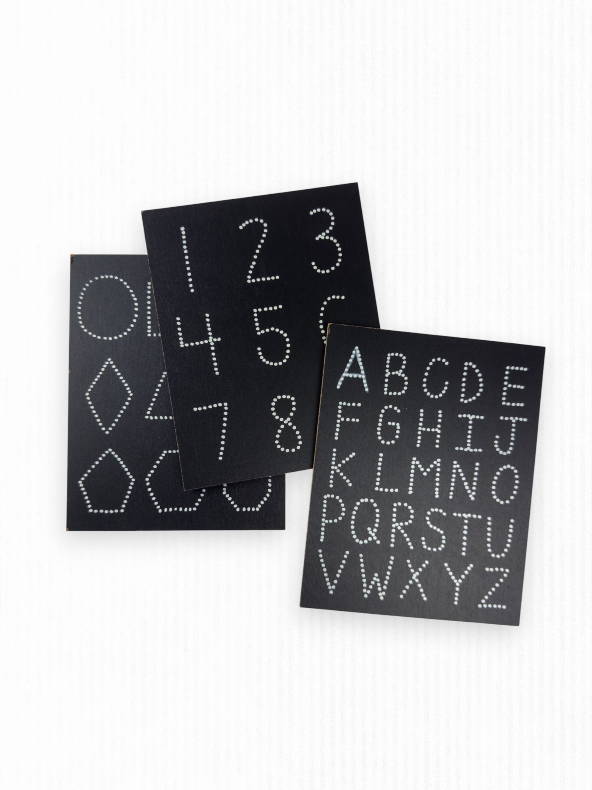 Set of three chalkboards with letters, numbers and shapes for tracing! Gently-used. Made by Chalk Full of Design. Each board is about 5.5" x 7" tall.