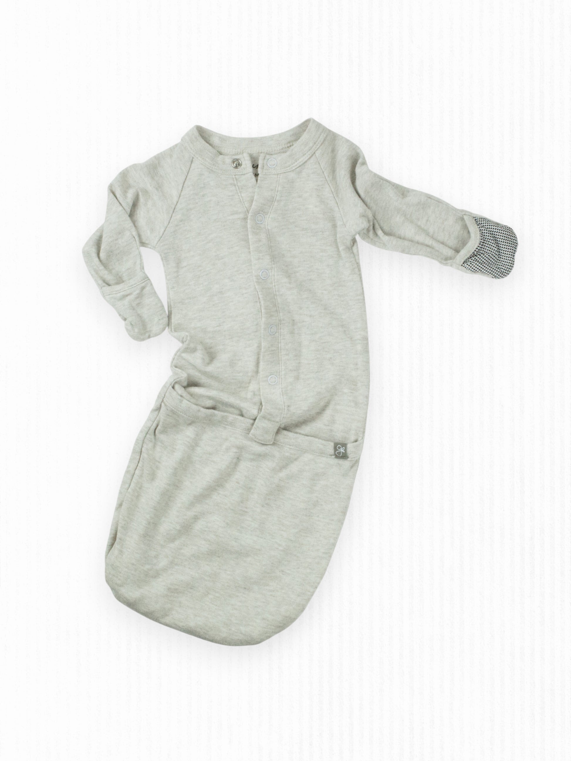 The coziest, high-quality gown sleeper in a soft oatmeal color with integrated mitts and a one-snap foot pocket to make for the easiest diaper changes!