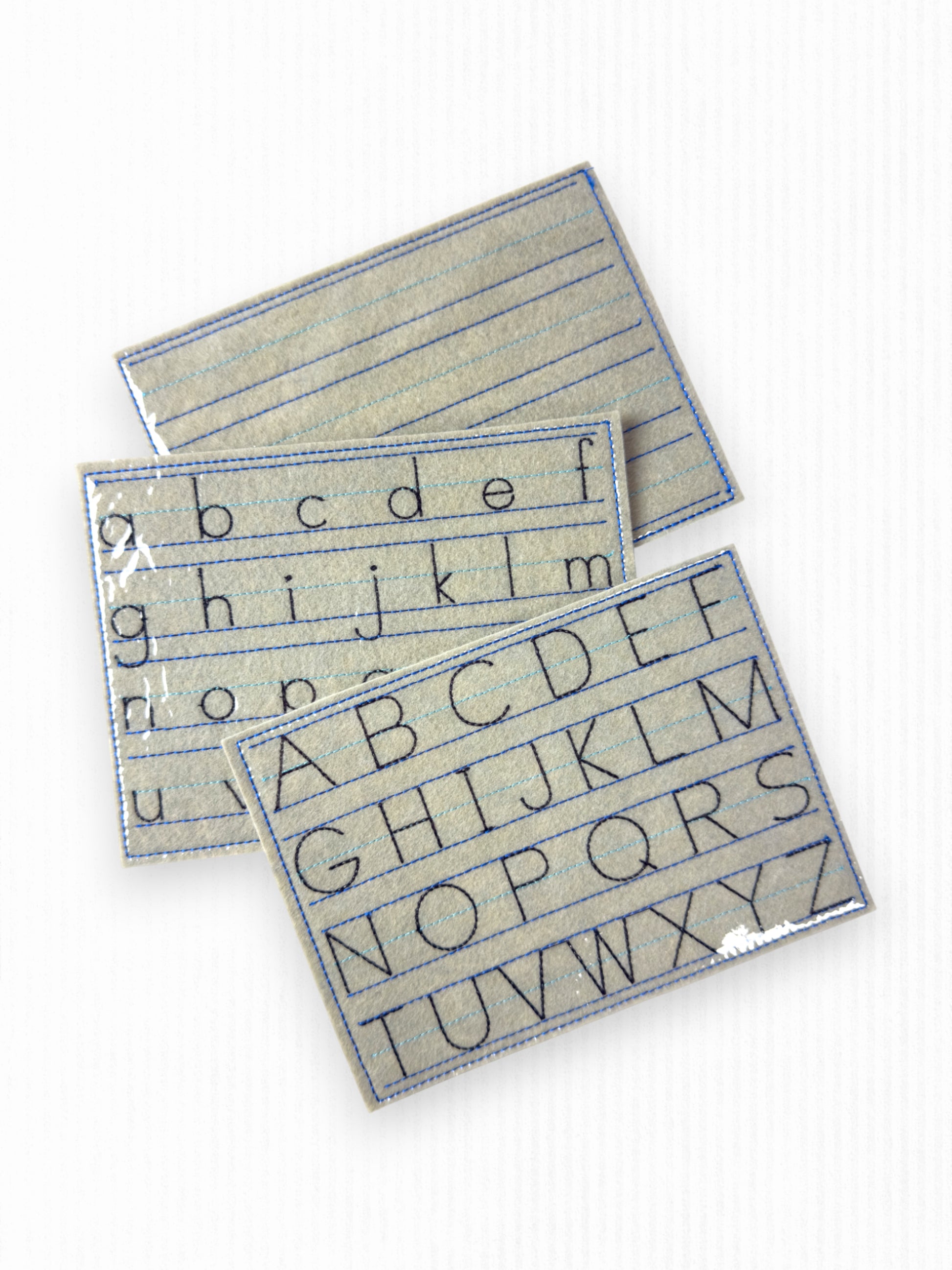 A very unique, handmade set of three tracing pages. Each page is made of felt with stitched lines and letters and then laminated for dry-erase marker tracing! Each page is about 5.5" x 7.5" across. These are brand new, never used!