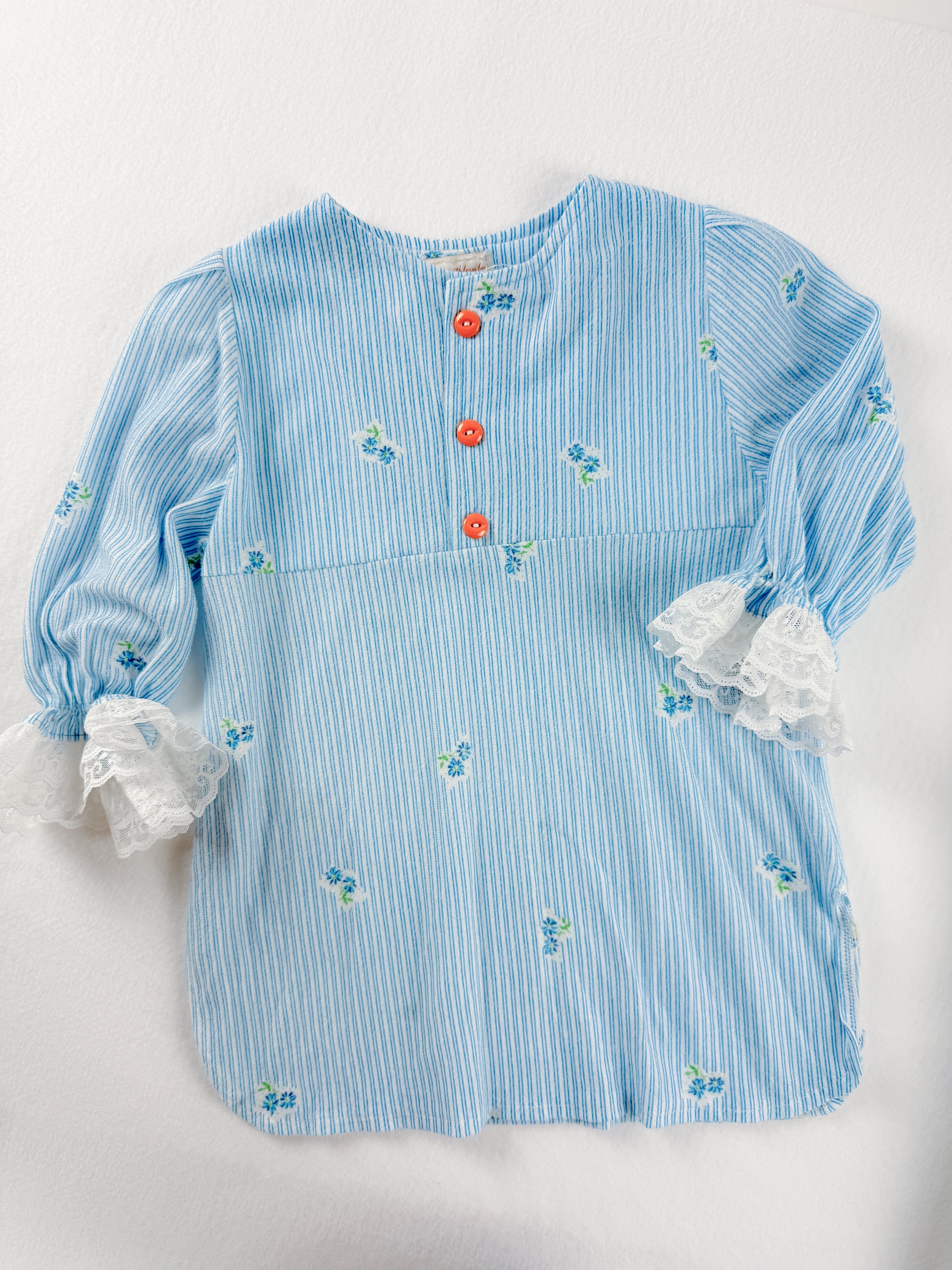 Vintage, handmade sleep shirt dress in soft stripes and sweet lace cuffs. Excellent condition. New buttons!