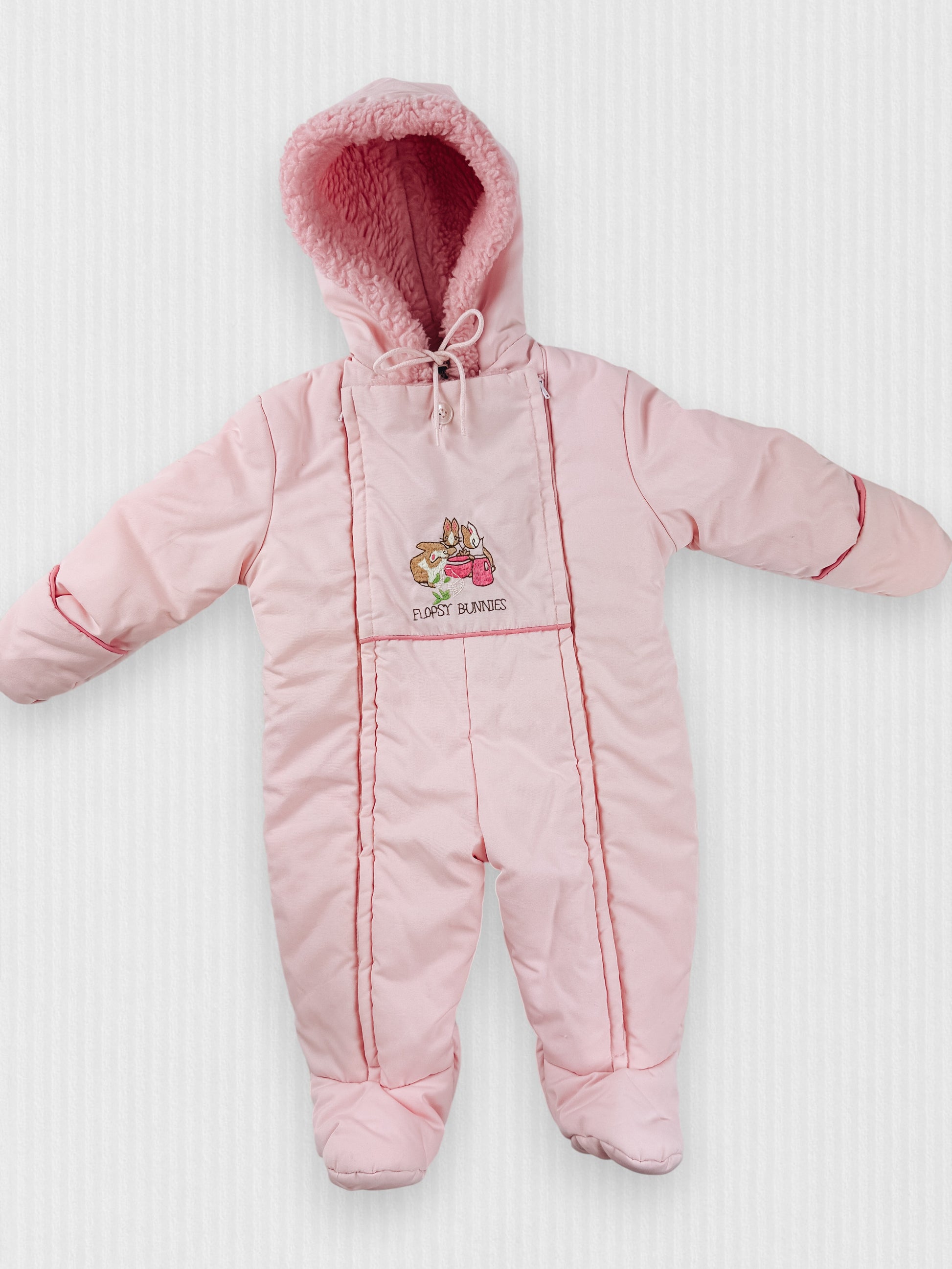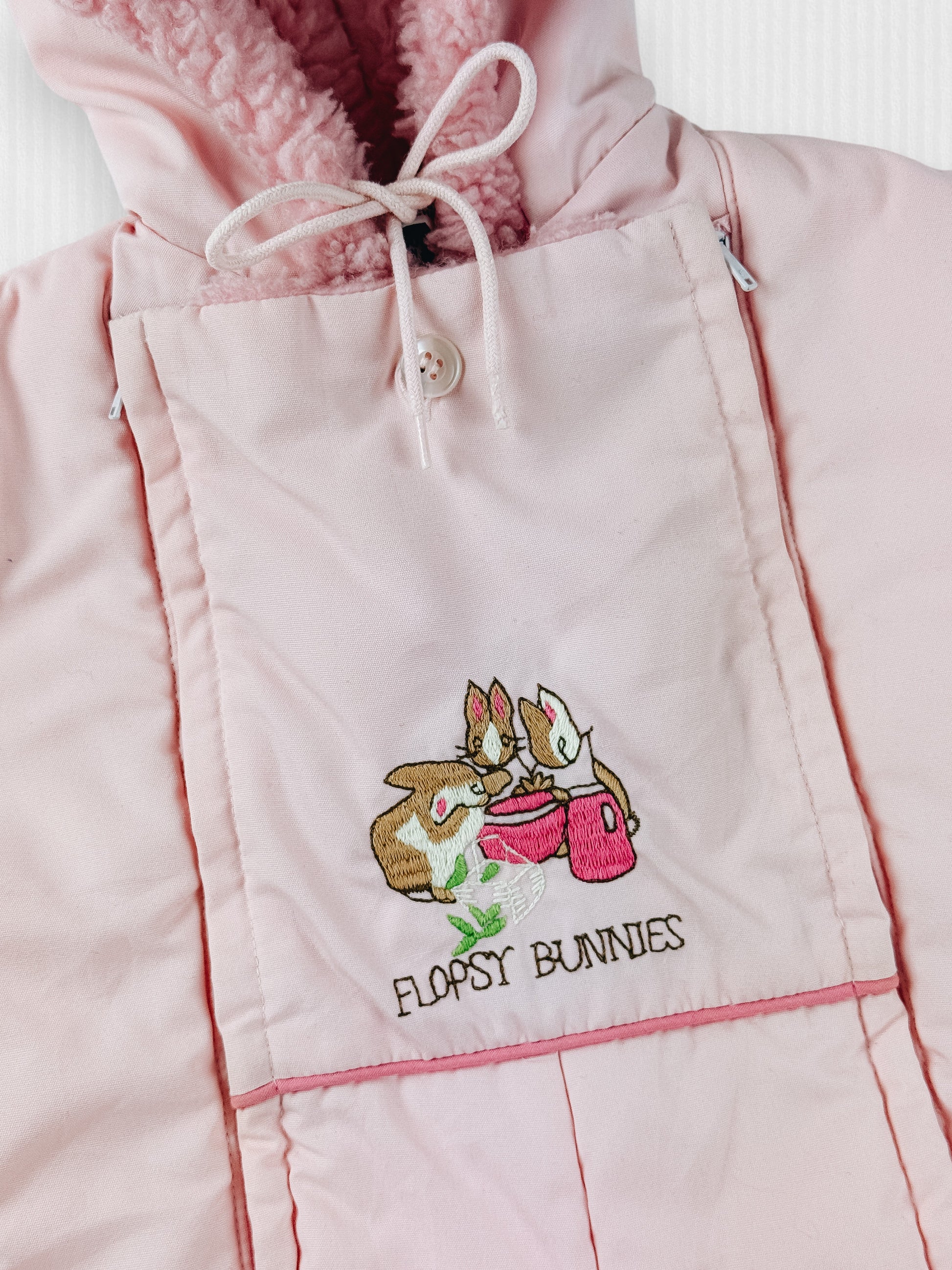 Fleece-lined, baby pink Quiltex Flopsy Bunnies jumpsuit with functioning drawstring, zippers and button closure. Looks brand new! Marked 6-9 months.